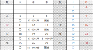 こんにちわ、だいぶ涼しくなってきましたが、いかがお過ごしでしょうか。11月の開室日は以下になります。寒暖差がある日が多いかもしれませんので、お身体ご自愛ください。